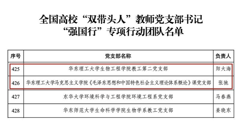 近日,教育部办公厅公布了全国高校“双带头人”教师党支部书记“强国行”专项行动(以下简称“强国行”专项行动)团队名单,我校生物工程学院教工第二党支部和马克思主义学院《毛泽东思想和中国特色社会主义理论体系概论》课党支部成功入选。